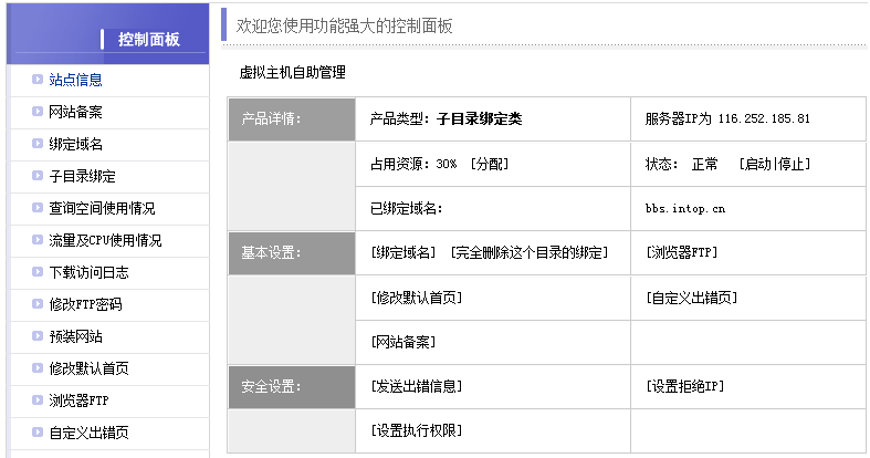 六、如果您需要對剛才開通的子目錄綁定多個域名,請在控制面板的右側(cè)菜單點擊“子目錄綁定”,在右側(cè)頁面會列出所有開通的子目錄,請您在相應(yīng)子目錄的“操作”欄目點擊“管理”。