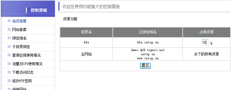 五、請您根據(jù)空間所開設(shè)網(wǎng)站的訪問情況合理分配資源,在“占用資源”欄目填寫該子目錄所占空間資源的百分比,然后點擊“提交”完成操作。