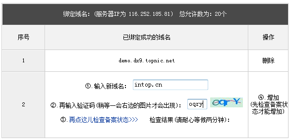 六、當(dāng)您的域名的備案信息錄入到系統(tǒng)的本地備案數(shù)據(jù)庫后,今后您添加該域名的二、三級或任意級的域名都不需要再查詢備案,可以直接增加域名綁定。請您在“①. 輸入新域名”欄目填寫要綁定的域名,然后直接點擊“增加”完成域名的綁定操作。