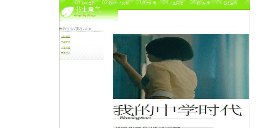 以上便是網(wǎng)站的幾個(gè)界面,還需更加完善。以個(gè)人主頁(yè)為首頁(yè),通過連接,連接到其他編好的網(wǎng)頁(yè)中,插入了Flash 元素,并使用javascript 腳本語(yǔ)言做表單驗(yàn)證,并實(shí)現(xiàn)了大圖滾動(dòng)效果,還為家鄉(xiāng)美景觀光插入了電子相冊(cè)。