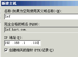 在對(duì)話框中,上面寫(xiě)名字,下面寫(xiě)地址。如果選中“創(chuàng)建相關(guān)……”,反向的PTR 記錄會(huì)自動(dòng)創(chuàng)建。