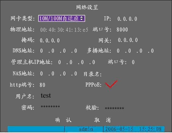 DVS 支持PPPOE 自動(dòng)撥號(hào)的功能可以連接Modem 進(jìn)行ADSL 撥號(hào)獲取公網(wǎng)IP 地址進(jìn)行訪問,方法是: 一:將設(shè)備ip 、掩碼、網(wǎng)關(guān)均設(shè)置為0.0.0.0