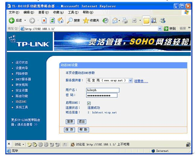 在動(dòng)態(tài)DNS 里面輸入我們剛注冊(cè)的帳號(hào)和密碼,并啟用動(dòng)態(tài)DNS ,點(diǎn)擊登陸。登陸成功后,會(huì)直接顯示目前護(hù)照的花生殼服務(wù)級(jí)別和能夠得到花生殼解析服務(wù)的域名,域名zengkebing.gicp.net 已經(jīng)可以綁定我們當(dāng)前的公網(wǎng)IP 了,動(dòng)態(tài)解析服務(wù)已經(jīng)做好了。