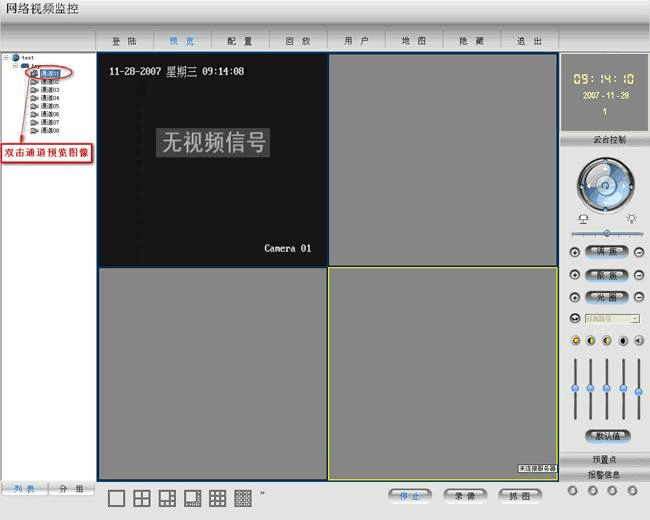 登陸成功后,雙擊左邊攝像頭列表當(dāng)中的攝像頭,可以看到一個(gè)監(jiān)控的頁(yè)面,就證明這個(gè)錄像機(jī)已經(jīng)正常在本地工作了。接下來,我們要對(duì)錄像機(jī)進(jìn)行網(wǎng)絡(luò)上的配置。