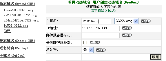 在主機名一欄填入你想申請的域名,然后點”確定”, 這樣就申請成功了。