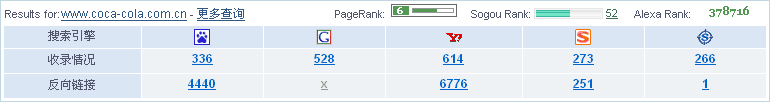 (5)網(wǎng)站PR 值對比,百事可樂的網(wǎng)站PR 值為5,可口可樂公司的PR 值為6。