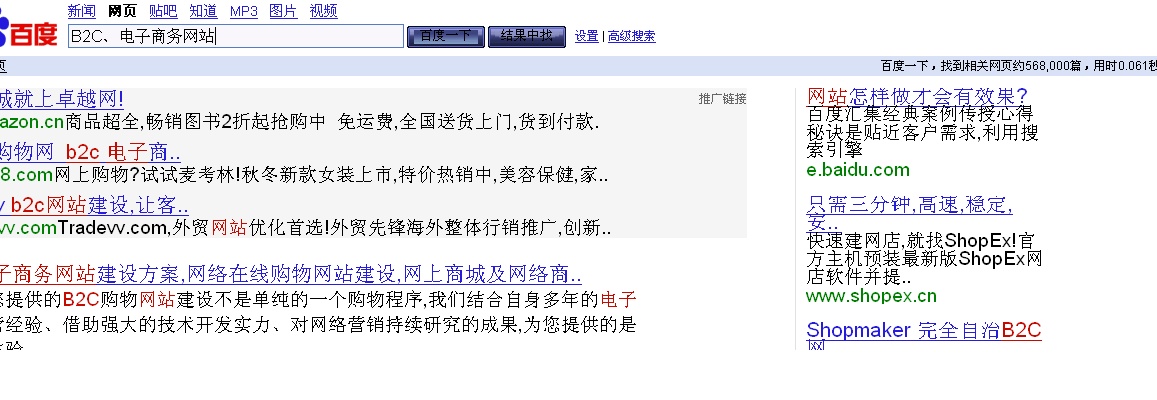 1、在輸入“電子商務(wù)網(wǎng)站”的搜索詞后,baidu 搜出可28200000條包括“電子商務(wù)網(wǎng)站”的查詢結(jié)果,用時(shí)0.041秒。