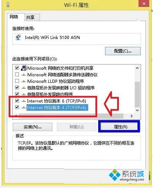4、在稍后演出的網絡連接屬性的“網絡”選項卡中找到“TCP/IPv4”這個選項,然后點擊右下方的“屬性”按鈕,如下圖所示: