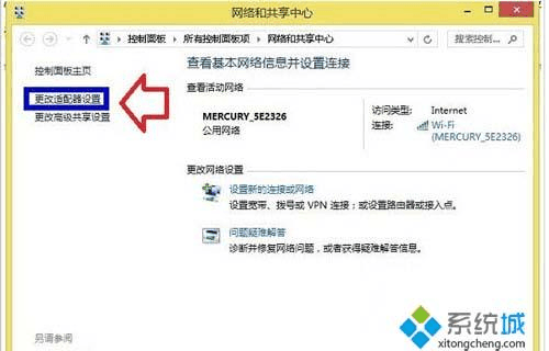 2、接下來在“網絡和共享中心”窗口中點擊左側的“更改適配器設置”,如下圖所示: