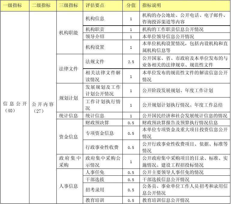 本次政府部門(mén)網(wǎng)站評(píng)估工作從信息公開(kāi)(40)、在線服務(wù)(35)、公眾參與(15)和網(wǎng)站管理(10)四個(gè)方面進(jìn)行考察。另設(shè)加分指標(biāo)和扣分指標(biāo),具體指標(biāo)及說(shuō)明如下: