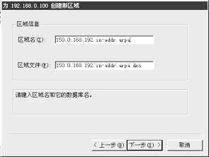 192.168.0.100 創(chuàng)建新區(qū)域”窗口。區(qū)域類型選“主要”,點(diǎn)擊“下一步”;在區(qū)域信息的“區(qū)域名”文本框中反向輸入“www1.mydom.com.cn 192.168.0.150”所對(duì)應(yīng)的 IP 地址,并在后面再加上