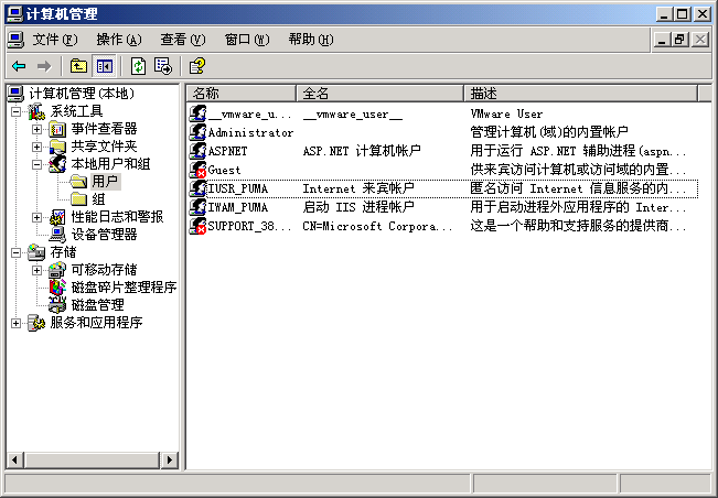 在“開始”—“所有程序”—“管理工具”程序組中添加一項“Internet 信息服務(IIS )管理器”,并會創(chuàng)建用于存放網(wǎng)站的SystemDriverInetpub文件夾。同時,添加相應的訪問Web 網(wǎng)站的帳號IUSR_Computername(如計算機名:“PUMA ”)和IWAM_Computername,其中IUSR_Computername是匿名用戶,用戶匿名訪問網(wǎng)站,IWAM_Computername用于啟動進程外應用程序的帳號,如運行ASP 或ASP.NET 應用程序。如下圖所示。