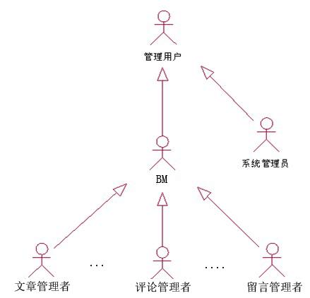 管理用戶是指管理端的用戶,這個(gè)此Actor 派生兩個(gè)子類, BM (博客管理員)和系統(tǒng)管理員,BM 是指在校園博客系統(tǒng)中通過管理端參與博客管理員工作的人員,他又可以派生多個(gè)子類如文章管理者、評(píng)論管理者和留言管理者。博客管理員具有發(fā)布,修改,刪除博客,查看博客,發(fā)表評(píng)論等權(quán)限。系統(tǒng)管理員是指對(duì)校園博客系統(tǒng)系統(tǒng)進(jìn)行相關(guān)設(shè)置、維護(hù)的人員,它也是通過管理端登錄對(duì)管理端的用戶進(jìn)行設(shè)置,分配權(quán)限等,它們的關(guān)系如圖A -3: