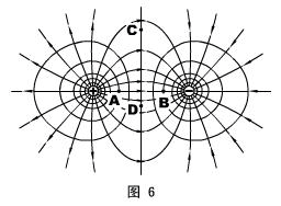 15、圖6展示了等量異種點(diǎn)電荷的電場(chǎng)線和等勢(shì)面,從圖中我們可以看出,A 、B 兩點(diǎn)的場(chǎng)強(qiáng) 、電勢(shì) ,C 、D 兩點(diǎn)的場(chǎng)強(qiáng) 、