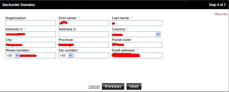 上圖是讓你填入域名注冊人的相應(yīng)信息,一便搶注成功后使用,填完后下一步