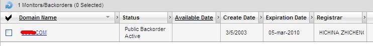 下圖中,Domain Name欄當(dāng)然是現(xiàn)在正在監(jiān)視的域名,狀態(tài) public backorder Active 表示 搶注正在進(jìn)行中,搶注失敗的話會顯示public backorder Active captured failed,你需要再搶注失敗后,手動刪除失敗的域名,設(shè)置新的搶注對象,刪除時(shí)你只需要勾選要刪除的域名,然后選擇上面的Remove Selected就可以了。