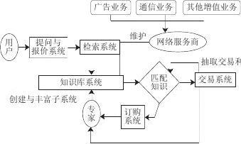 給出答案,并將新知識(shí)擴(kuò)充進(jìn)知識(shí)庫(kù),以避免知識(shí)的重復(fù)創(chuàng)造。最后通過(guò)交易系統(tǒng)完成知識(shí)的獲取。其中知識(shí)庫(kù)系統(tǒng)由不同的子知識(shí)庫(kù)組成,由不同專家組和網(wǎng)絡(luò)服務(wù)商共同管理。網(wǎng)絡(luò)服務(wù)商可以從每次交易中抽取利潤(rùn)實(shí)現(xiàn)盈利,并通過(guò)廣告、通信和其他增值業(yè)務(wù)支撐威客模式的運(yùn)作。