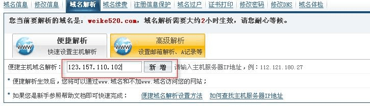 3、在域名解析后面的方框中輸入空間的IP 地址,點(diǎn)擊新增