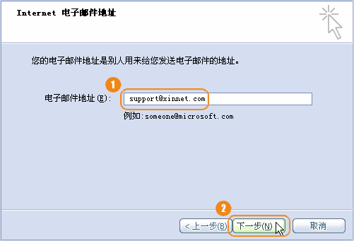 (4)輸入郵箱管理員分配給您的郵件地址,如:support@xinnet.com,然后點擊“下一步”。