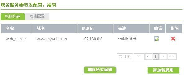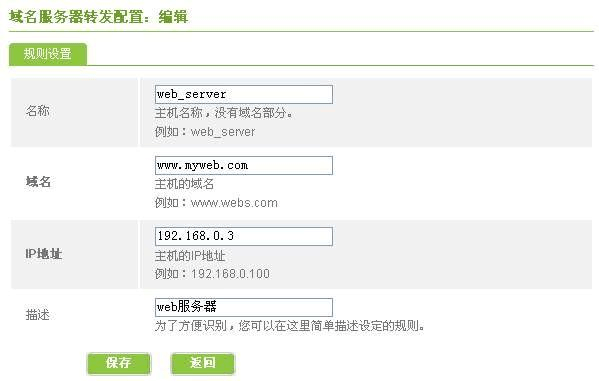 本界面提供域名服務(wù)功能,路由器直接向內(nèi)網(wǎng)的計算機(jī)轉(zhuǎn)發(fā)其域名緩存列表中的域名地址。域名轉(zhuǎn)發(fā)工作的前提是“啟用DNS 緩存轉(zhuǎn)發(fā)”功能。通過域名轉(zhuǎn)發(fā)規(guī)則,可以將指定的域名同指定的IP 地址綁定起來,在內(nèi)網(wǎng)中生效,這個設(shè)置同外部網(wǎng)絡(luò)的DNS 解析沒有關(guān)系。比如:內(nèi)網(wǎng)有臺WEB 服務(wù)器,IP 地址為192.168.0.3 ,設(shè)定域名為www.myweb.com 。設(shè)置