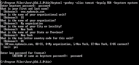 系統(tǒng)會提示您輸入 keystore 密碼,缺省密碼為:changeit,您可以指定一個新的密碼,但請一定要記住。