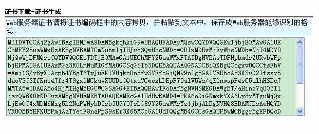 注意:文本框中的內(nèi)容就是此次申請的證書,請一定將內(nèi)容拷貝保存下來,如果內(nèi)容丟失,就必須進(jìn)行證書補(bǔ)辦。
