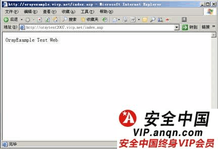 打開(kāi)IE 瀏覽器,在地址欄中輸入http://oraytest2007.vicp.net進(jìn)行測(cè)試。在這里要提醒用戶,很多時(shí)候忘記設(shè)置自己的默認(rèn)首頁(yè)文檔,因此造成無(wú)法訪問(wèn)。(可以在站點(diǎn)屬性――文檔中進(jìn)行設(shè)置)