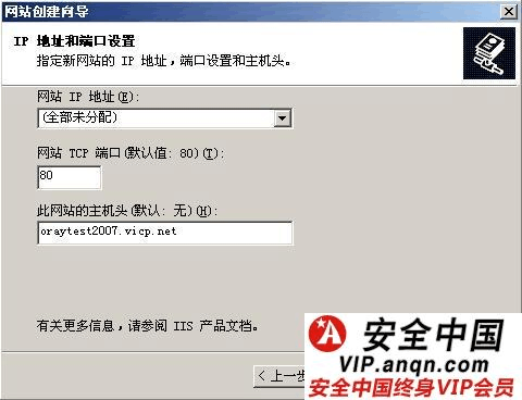 ,主機(jī)頭:在這里填入別人訪問(wèn)您網(wǎng)站的域名,如果有多個(gè)域名可以隨后在站點(diǎn)屬性里面進(jìn)行修改。 確定輸入資料正確以后點(diǎn)擊 < 下一步 >。