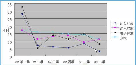 21. 某銀行國際業(yè)務(wù)部通過折線圖比較業(yè)務(wù)處理效率情況,可掌握業(yè)務(wù)效率變化,及時發(fā)現(xiàn)業(yè)務(wù)延遲和低效率,提高服務(wù)水平,下面是匯入?yún)R款,會出匯款,電子轉(zhuǎn)發(fā),分報四種業(yè)務(wù)的折線圖。請根據(jù)該折線圖分析并回答以下問題。