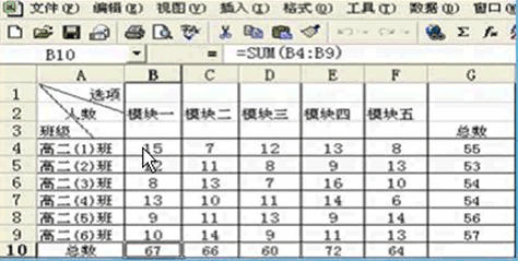 (1)上圖單元格D10中表示所有班級選擇“模塊三”的人數(shù)之和,單元格G5表示高二(2)班參與模塊選修的人數(shù),若C4的值發(fā)生變化,則值發(fā)生變化的單元格有哪些?____________________