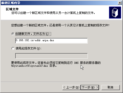 ⑶ 單擊【下一步】,創(chuàng)建區(qū)域文件【0.168.192.in-addr.arpa.dns 】。