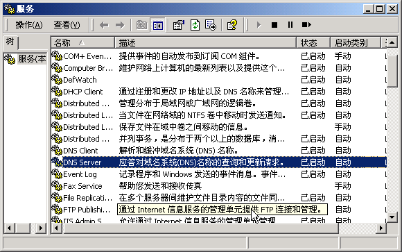 選擇【控制面板】的【管理工具】的【服務(wù)】,可停止/啟動DNS 服務(wù)。DNS 安裝完成后,已自動啟動。