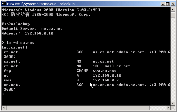 ⑶ 輸入192.168.0.2,解析為www.cz.net ;輸入192.168.0.10,解析為ns.cz.net ,這是反向解析。