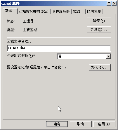 ,第一個頁簽是【常規(guī)】,區(qū)域文件名【cz.net.dns 】在【C:WINNTSYSTEM32】下,可以先備份下來,以便發(fā)生災(zāi)難時的修復(fù)。默認情況下,【允許動態(tài)更新(w )】為【否】,如果你想讓這臺DNS 服務(wù)器為Windows 2000的域提供服務(wù)的話,會引起問題的,因此將【否】改為