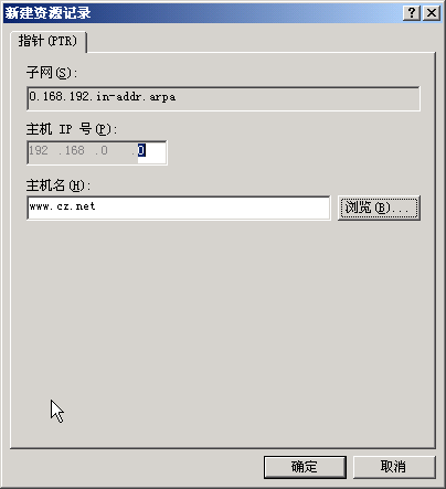 右擊【反向搜索區(qū)域】下的【192.168.0.x Subnet】選擇【新建指針】,主機IP 號為192.168.0.2,主機名為www.cz.net ,單擊【確定】則建立了一個IP 地址到域名的PTR 記錄。