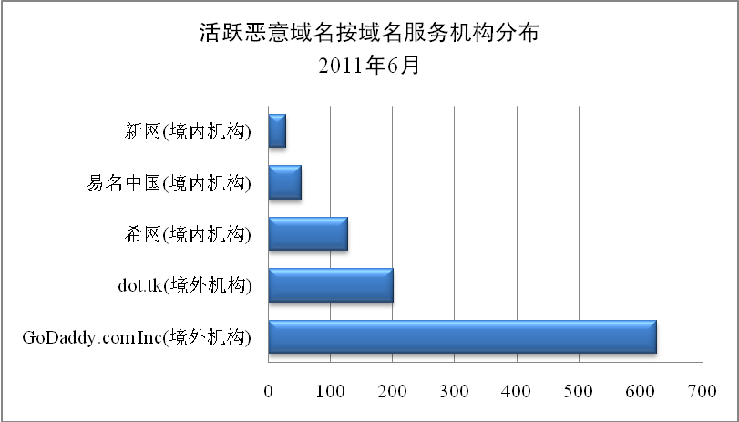 網(wǎng)絡病毒在傳播過程中,往往需要利用黑客注冊的大量域名。根據(jù)CNCERT 對活躍惡意域名的分類跟蹤,2011年6月,活躍惡