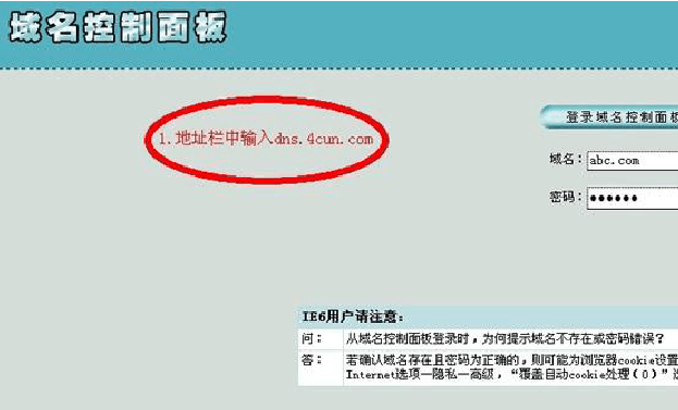 在瀏覽器中輸入http://dns.4cun.com/,(申請域名的時候,域名服務商會提供一個域名管理后臺,請各自進自己的域名管理后臺設置修改,本文只是以中國數(shù)據(jù)的域名管理平臺為例,以上為中國數(shù)據(jù)的后臺登陸接口。)界面如下圖 輸入域名和密碼,注意域名前不要加