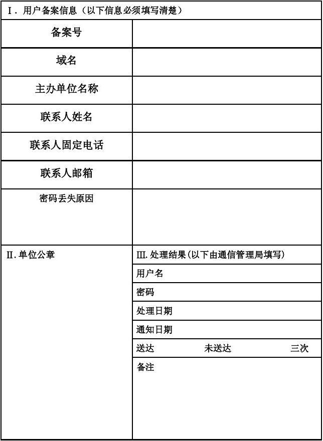 單位用戶密碼找回:在“單位公章”加蓋單位公章,并將備案時(shí)所用企業(yè)證件復(fù)印件(即營(yíng)業(yè)執(zhí)照或組織機(jī)構(gòu)代碼證),域名證書(即域名購(gòu)買商提供的域名所有者證書)連同申請(qǐng)表一起發(fā)送。