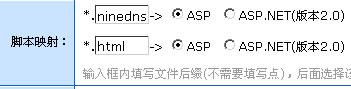 輸入框為要映射的文件后綴,后面為解析的腳本引擎(由于該款空間僅支持ASP 和ASP.net ,因此只有這2個選擇;我選擇了主站使用asp.net2.0,所以這里只能是2.0,如果我選擇為