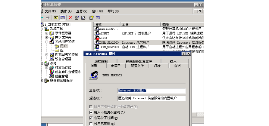 控制面板->管理工具->計算機管理->本地用戶和組,將IUSR_機器名賬號啟用。 問題6:NTFS 權限設置不當