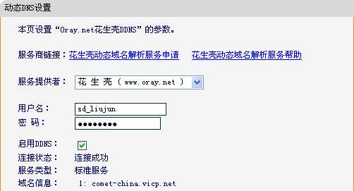 如下圖所示,下面的是一種類(lèi)型的路由器自帶了“動(dòng)態(tài)DNS”設(shè)置功能,它綁定了“花生殼動(dòng)態(tài)域名解析”功能,我們首先在“花生殼”網(wǎng)站上申請(qǐng)了賬戶,例如我們輸入賬戶:sd_liujun。將賬戶、密碼輸入,勾選“DDNS ”,然后選擇“登陸”,如果這個(gè)賬戶已經(jīng)在“花生殼”網(wǎng)站上面注冊(cè)的了,則會(huì)連接成功,并顯示這個(gè)賬戶對(duì)應(yīng)的域名信息“comet-china.vicp.net ”。