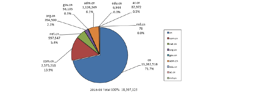 ,通過對以上數據的分析,我們可以看出2016年3月份相比2月份.CN 域名有一定幅度的增長,adm.cn 有一定幅度的下降,其他域名有小幅度的變動。這也充分證明了前文中所說的中國CN 域名備受企業(yè)的青睞,這與我國的對域名的管理以及政策法規(guī)是密切相關的。