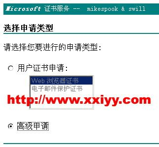 在“選擇申請類型”的時候應(yīng)該選擇“高級申請”,以便導(dǎo)入在第二步時生成的IIS 證書(圖18)。