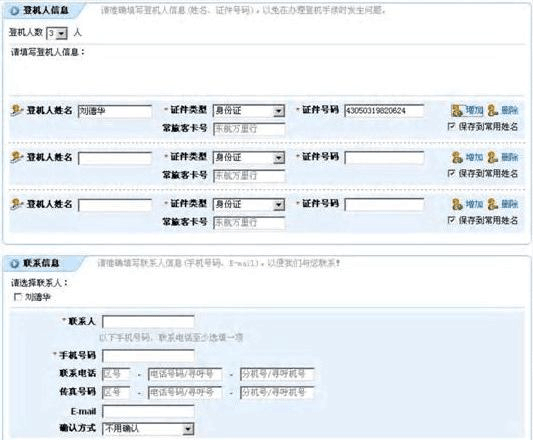 預(yù)定信息的填寫:我們要求有*乘機人的姓名,*證件號碼,*手機號,*聯(lián)系人的姓名,*聯(lián)系方式,傳真號,E-mail ,配送方式(網(wǎng)上支付,送票付款,