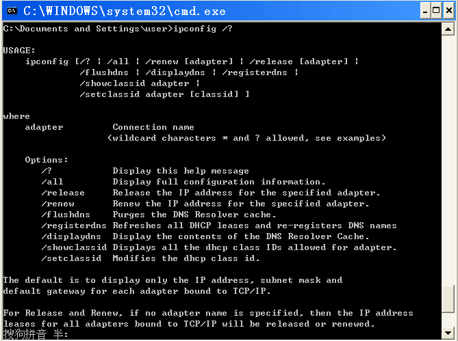 在命令提示符界面執(zhí)行ipconfig ,可以顯示本機所以當前的TCP/IP網(wǎng)絡配置值,刷新動態(tài)主機配置協(xié)議(DHCP )和域名系統(tǒng)(DNS )設置。