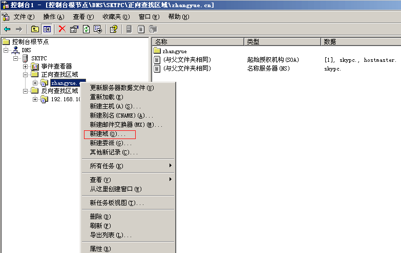 (1) 在DNS 控制臺(tái)的“zhangyue .cn”區(qū)域上單擊右鍵,選擇“新建域”: