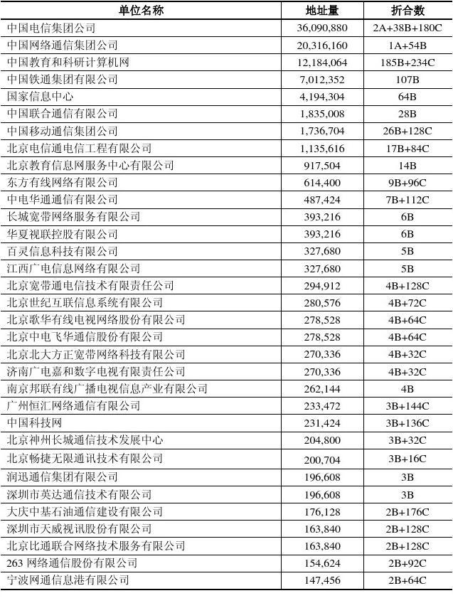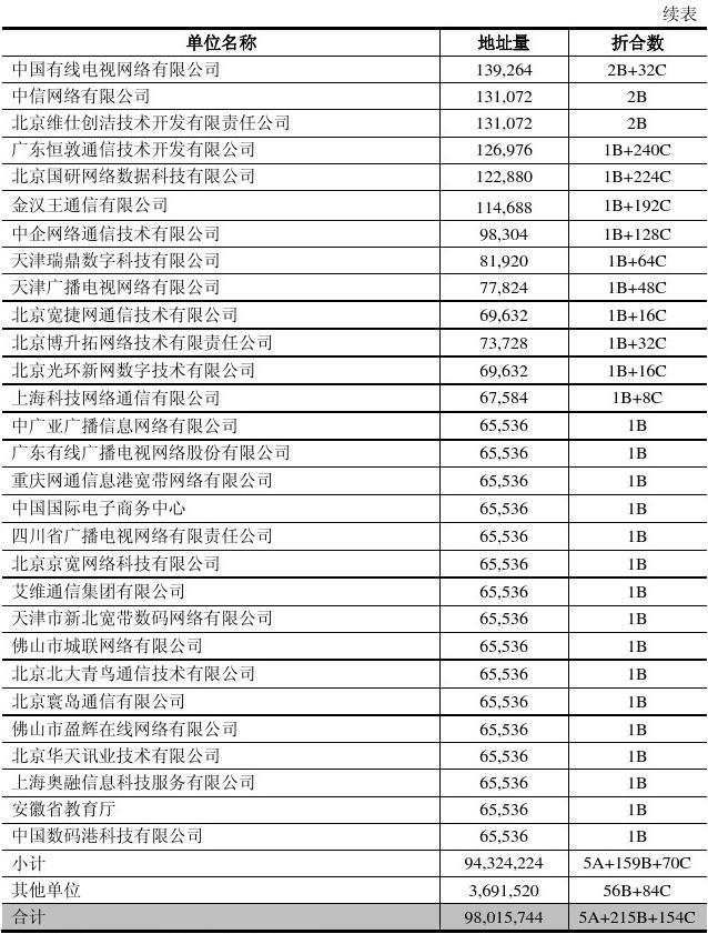 注2:IPv4地址分配表只列出擁有IPv4地址數(shù)大于等于1B 的單位。