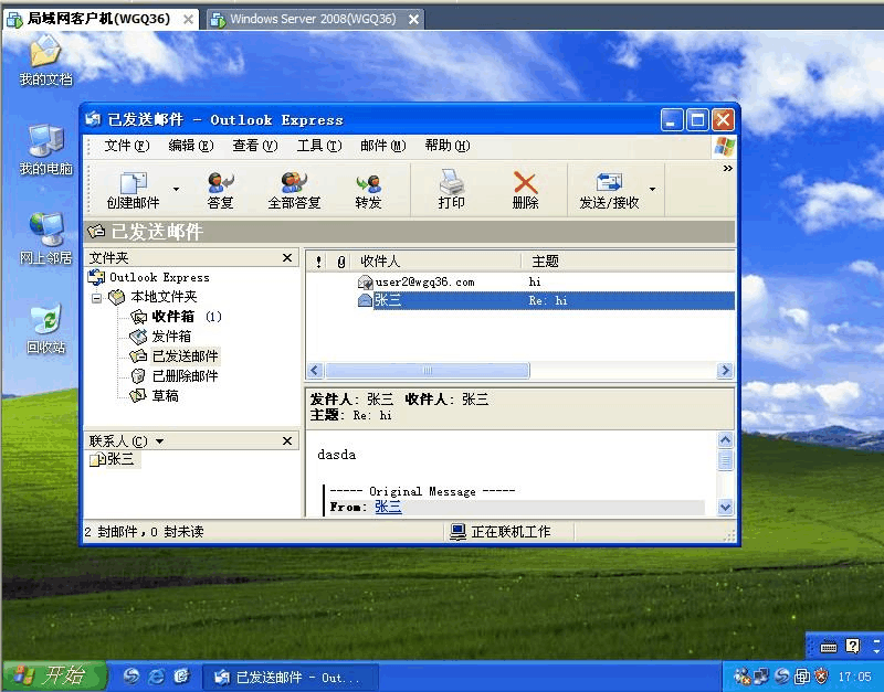 2) 配置outlook ,用lzh1賬戶給lzh2賬戶發(fā)郵件,顯示outlook 已發(fā)送文件夾的界面,