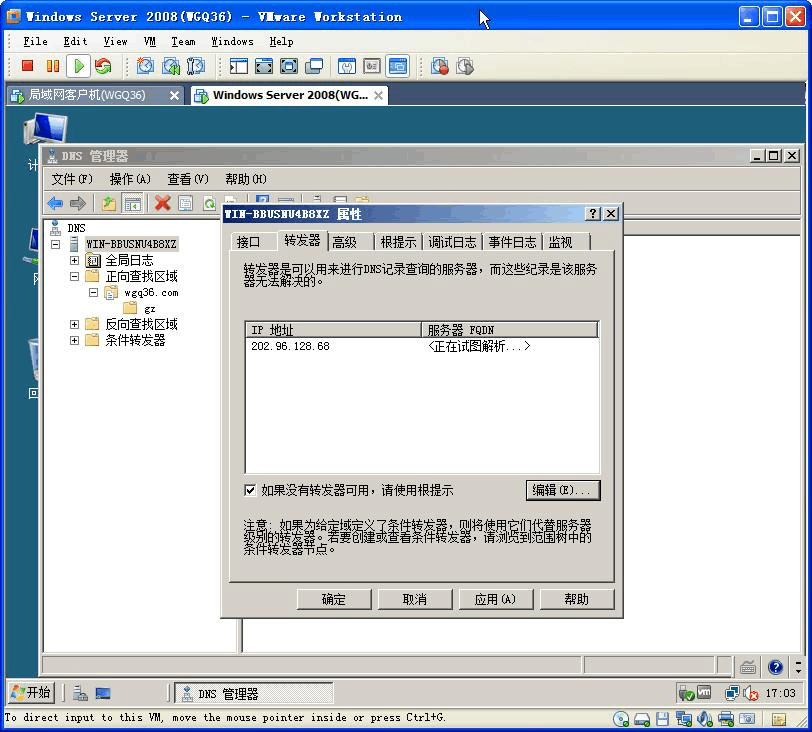 5) 設(shè)置DNS 轉(zhuǎn)發(fā)器:202.96.128.68。截圖(圖3):