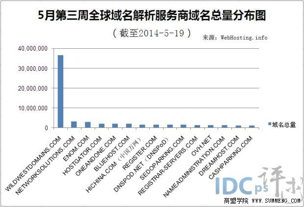 WILDWESTDOMAINS.COM 獨(dú)占鰲頭。而中國,仍僅有中國萬網(wǎng)和DNSPod 兩家上榜。下面,IDC 評述網(wǎng)與大家一起關(guān)注5月第三周全球各域名解析服務(wù)商最新動態(tài)。
